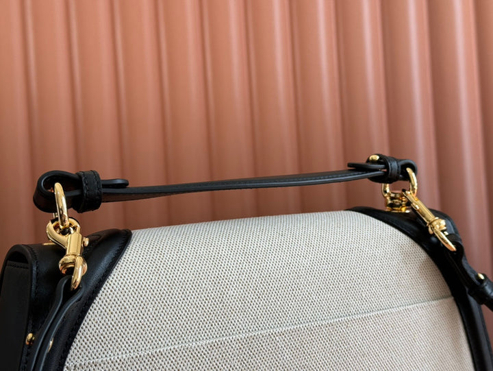 BLONDIE LARGE TOP HANDLE BAG 32 IN NATURAL COTTON LINEN CANVAS BLACK CALFSKIN