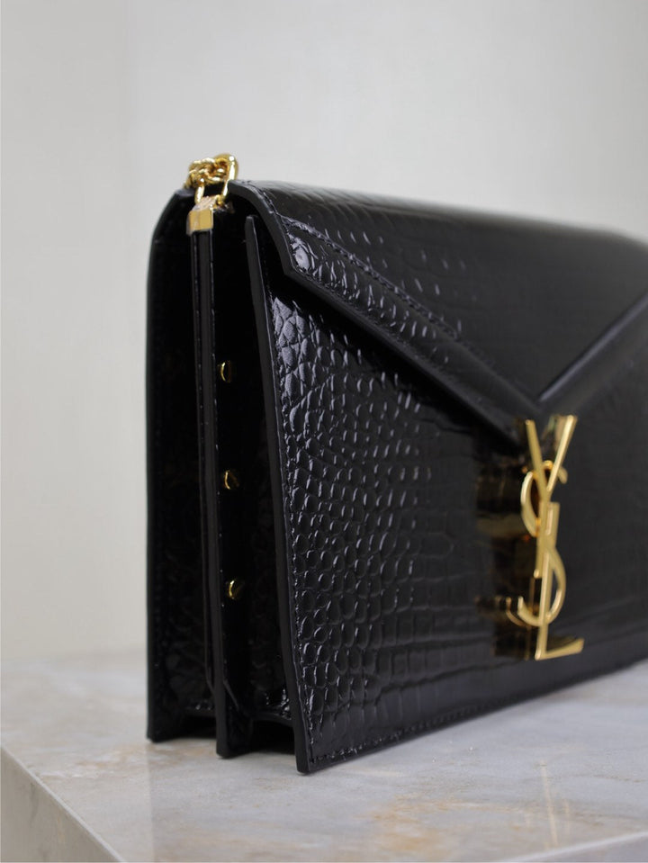 CASSANDRA CHAIN BAG 22 IN BLACK CROCODILE PATTERN CALFSKIN GOLD HARDWARE