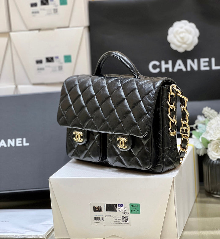DOUBLE POCKETS FLAP BAG TOP HANDLE 24 IN BLACK LAMBSKIN GOLD HARDWARE
