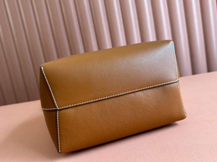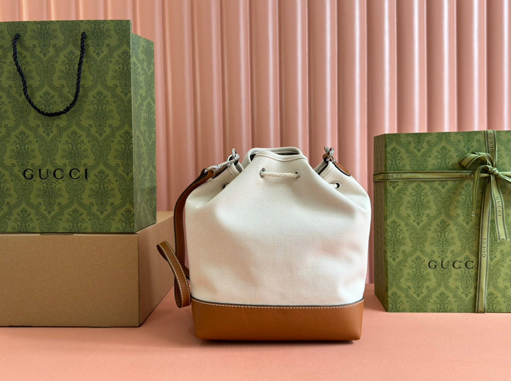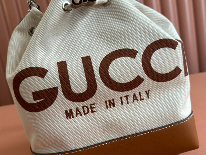 DRAWSTRING SHOULDER BAG LOGO PRINT 31 IN WHITE CANVAS BROWN CALFSKIN