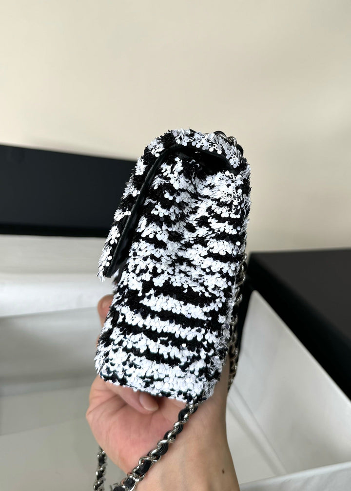 FLAP BAG 20 IN BLACK AND WHITE SEQUINS SILVER HARDWARE