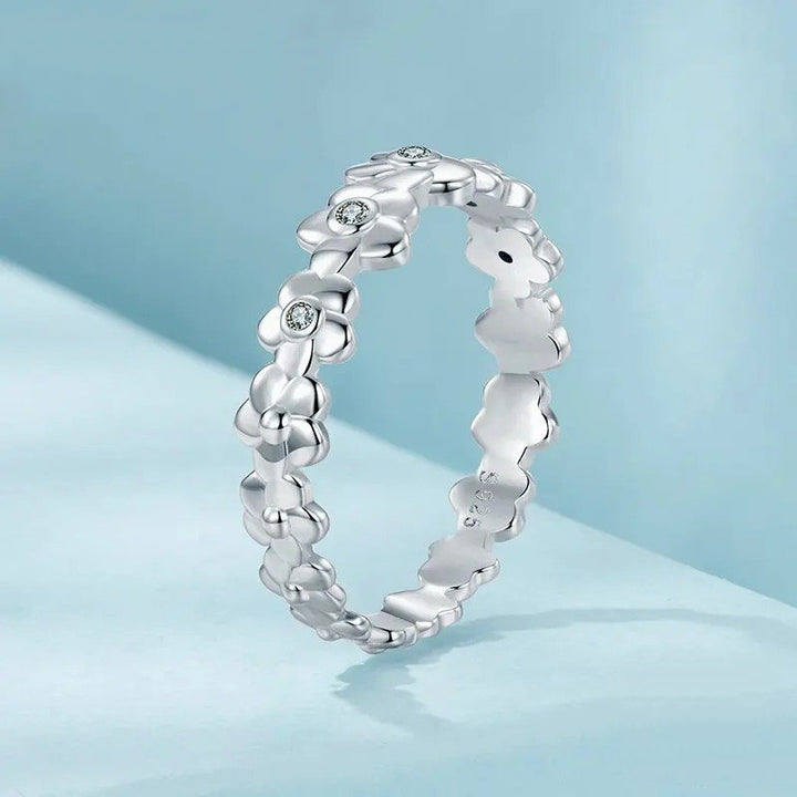 ? [Description] The ring features with a circle of small flower symbolizing a positive, cheerful, and optimistic attitude towards life.