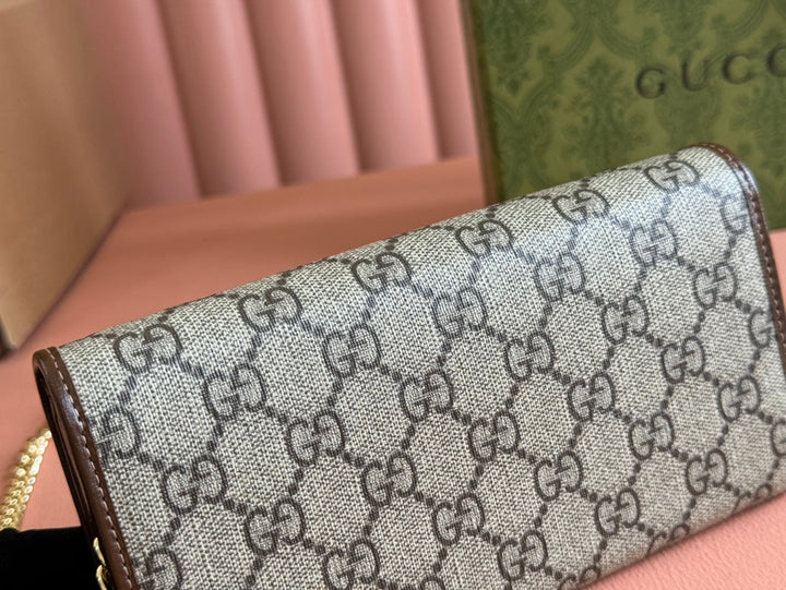 HORSEBIT 1955 WALLET IN BEIGE EBONY CANVAS MIX BROWN CALFSKIN GOLD CHAIN
