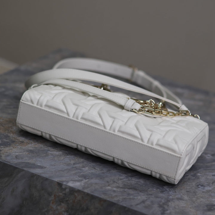 LADY D-JOY BAG 26 IN WHITE GRAPHIC CANNAGE CALFSKIN PALE GOLD-FINISH METAL CHARMS
