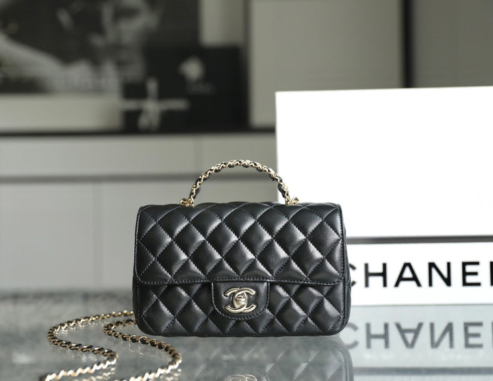 MINI RECTANGLE FLAP BAG TOP HANDLE 20CM BLACK LAMBSKIN SILVER HARDWARE