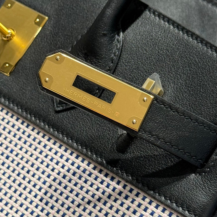 QUADRILLE BIRKIN 30CM IN BLACK SWIFT CALFSKIN WHITE BLUE PINK PLAID TOILE CANVAS