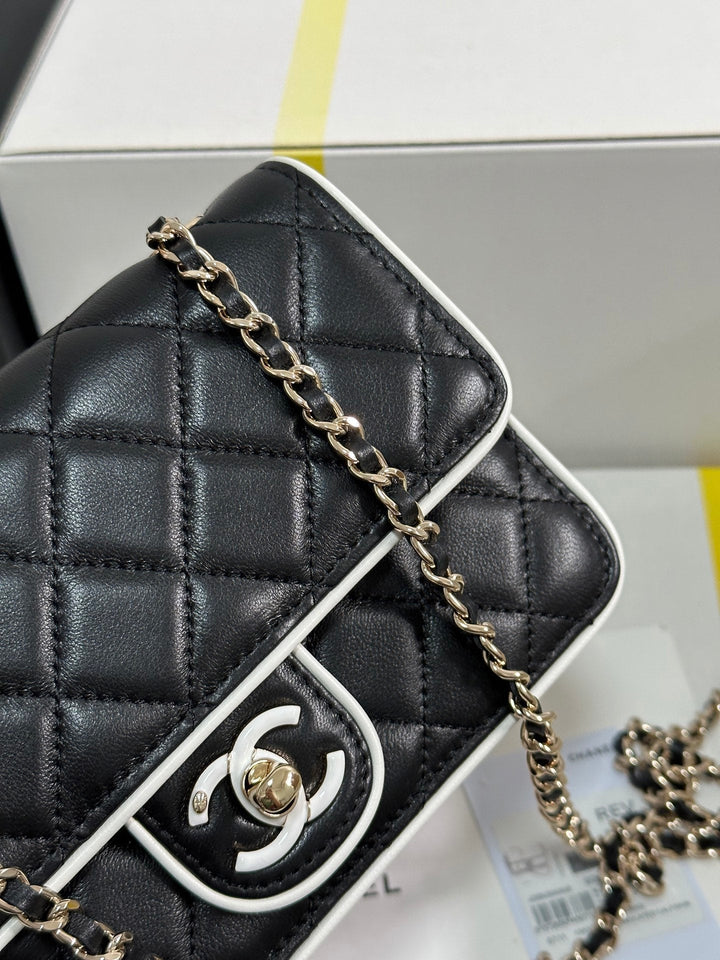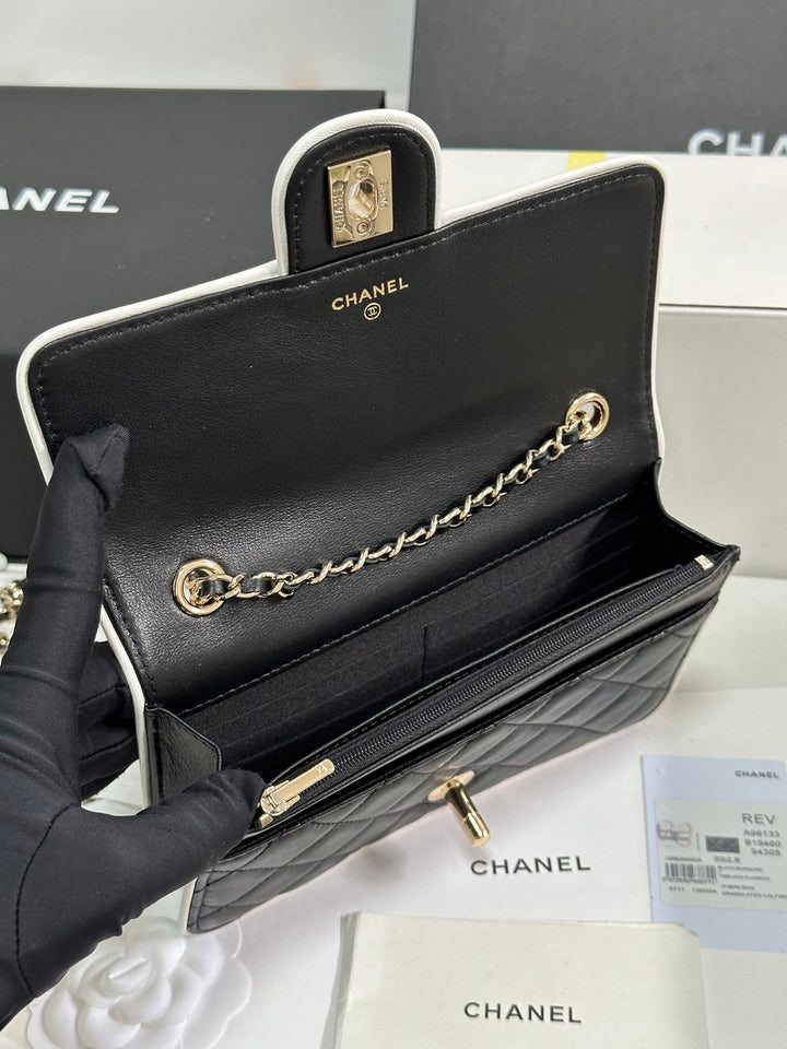 QUILTED FLAP BAG WITH WHITE TRIM 19 IN BLACK LAMBSKIN