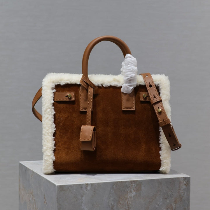 SAC DE JOUR 26 IN BROWN SUEDE AND WHITE SHEARLING TRIM
