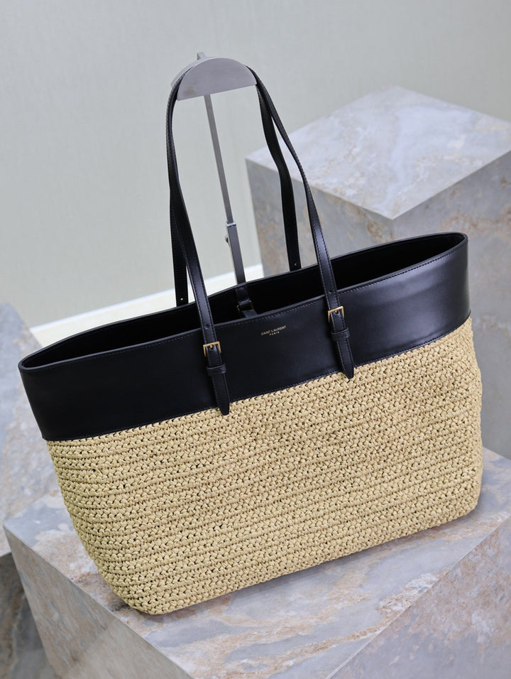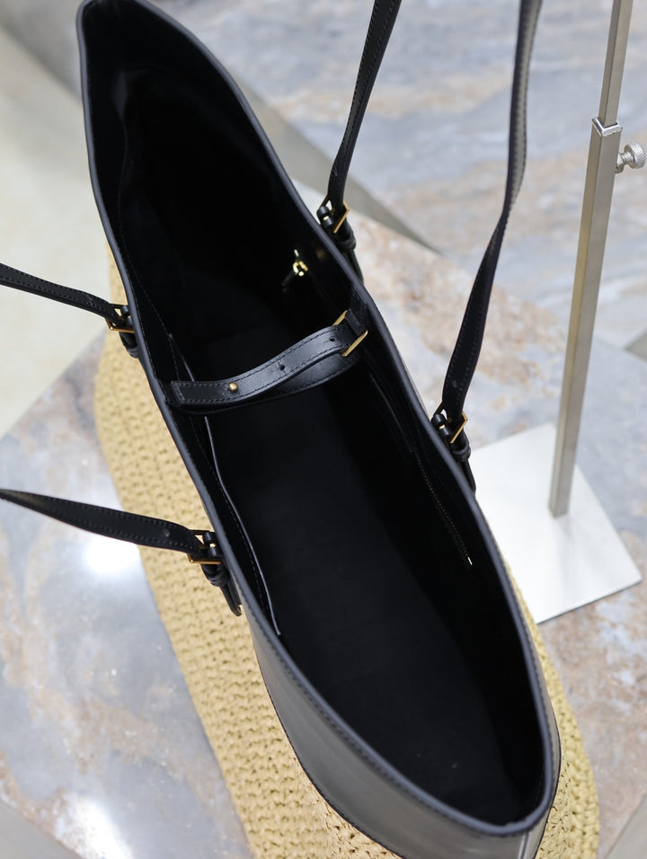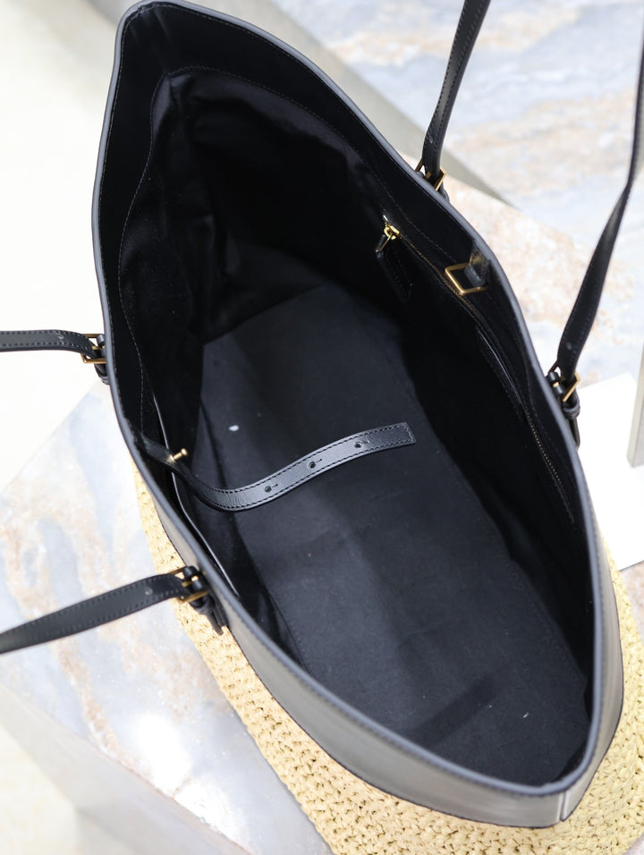 SHOPPING TOTE BAG 38 IN BEIGE WOVEN RAFFIA AND BLACK CALFSKIN