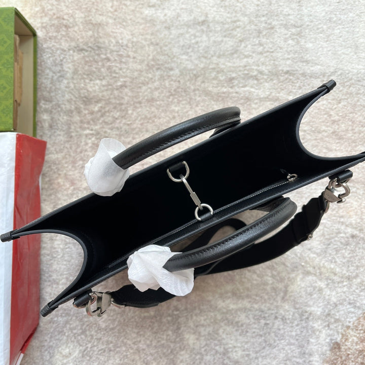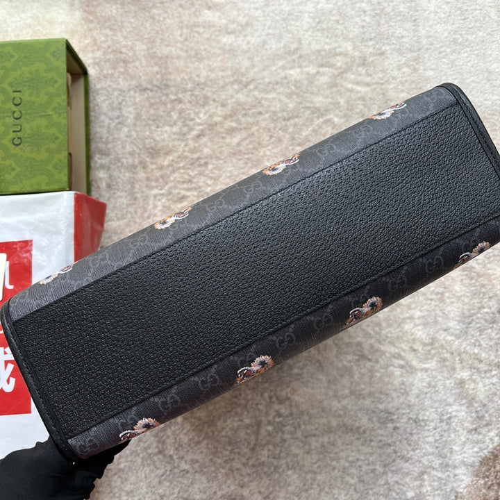 TIGER PRINT MEDIUM TOTE BAG 38 IN BLACK CANVAS AND LEATHER TRIM