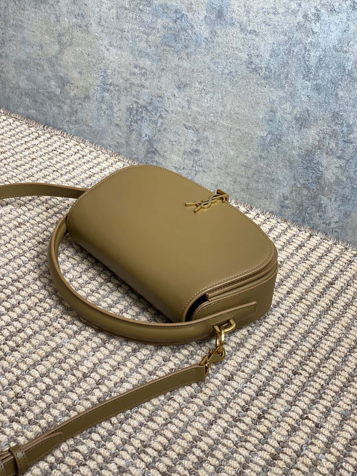VOLTAIRE HALF-MOON SHOULDER BAG 24 IN CEDAR BROWN CALFSKIN GOLD METALLIC